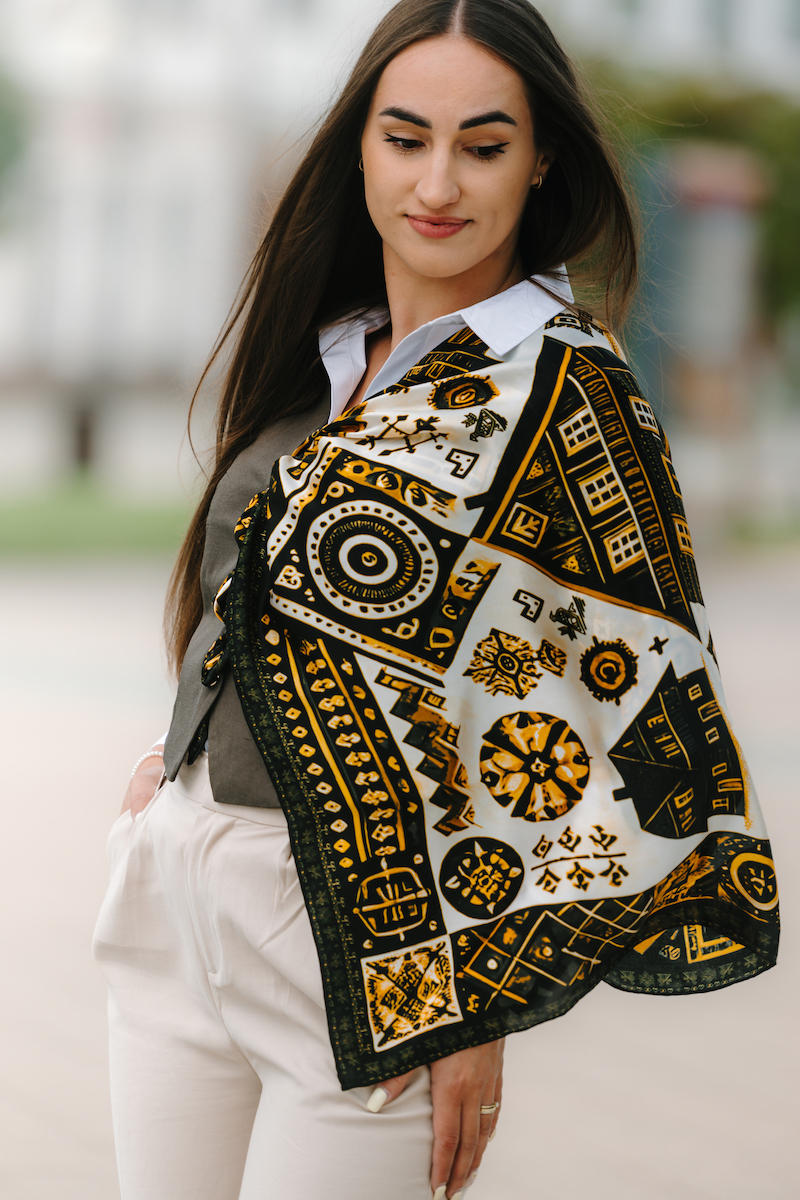 -klasická šatka okolo krku – vďaka vlastnostiam hodvábu je vhodné nosenie celoročne