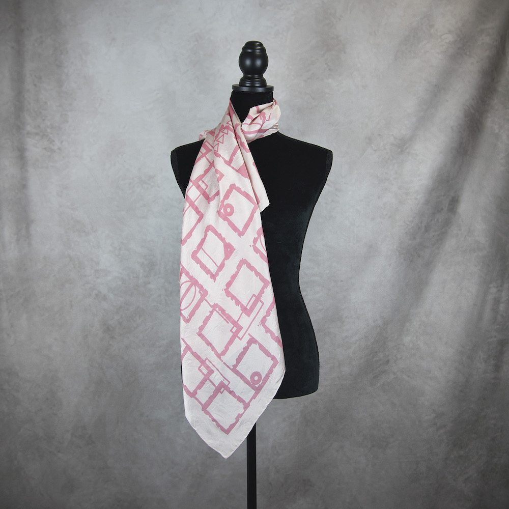 Hodvábna šatka vyrobená u nás na Slovensku. Hodvábna látka je ľahká, izolačná, priesvitná a pohodlná a skvele sa nosí v každom ročnom období. Táto krásna šatka je živá a elegantná a má skvelú veľkosť na kreatívne viazanie. Farba je zafixovaná, šatka vypratá a ošetrená fixátorom farieb, kraje sú strojovo prešité dekoračným prešívaním a následne je celá šatka vyžehlená.