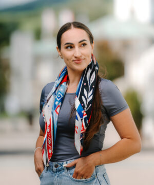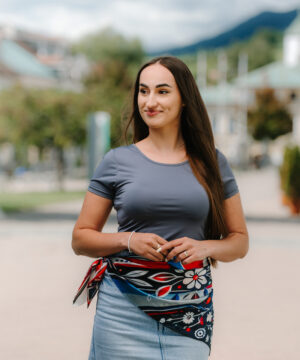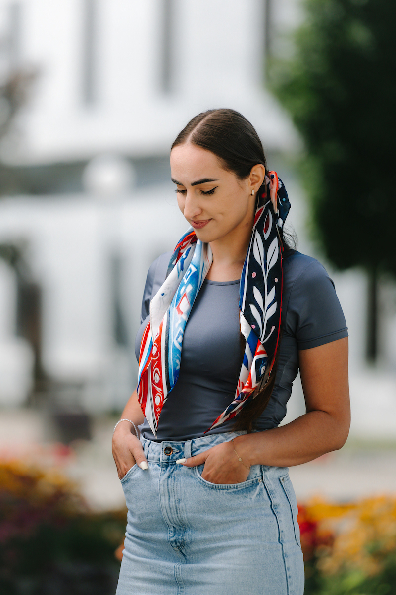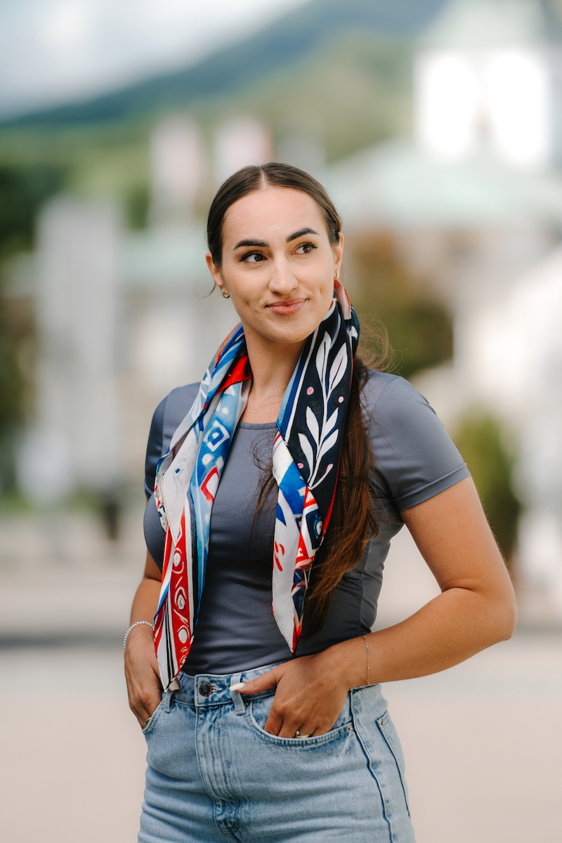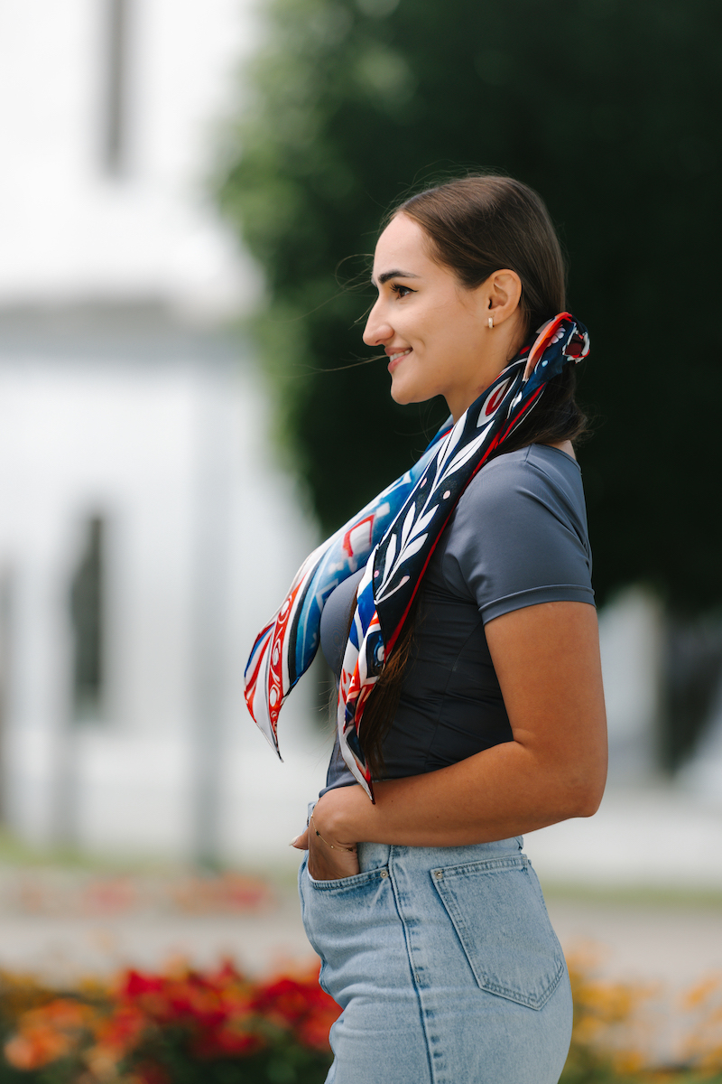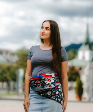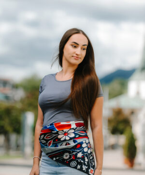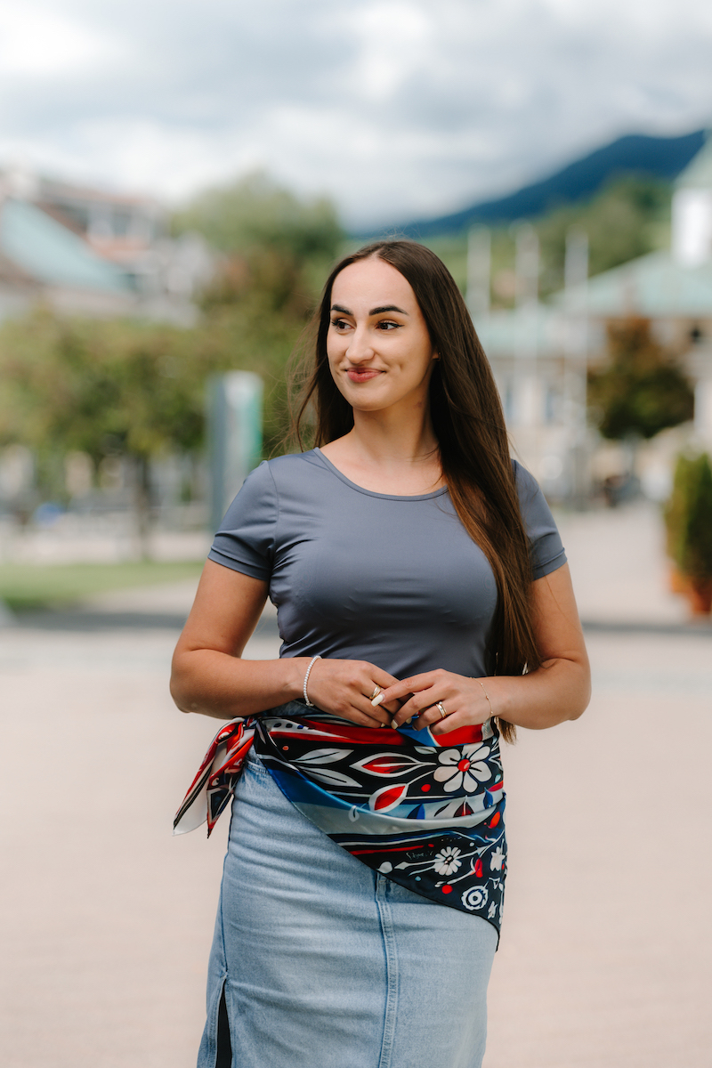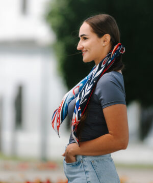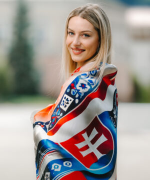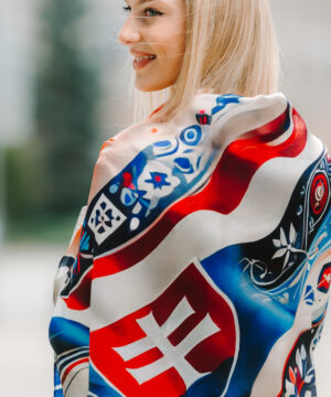 Slovenská vlajka je trikolóra zložená z troch vodorovných pruhov: bieleho, modrého a červeného. Na prednej polovici vlajky je umiestnený slovenský štátny znak. My sme ju dotvorili do kreatívnej podoby na hodvábnu šatku.