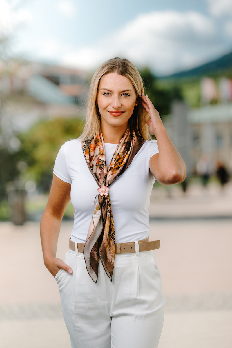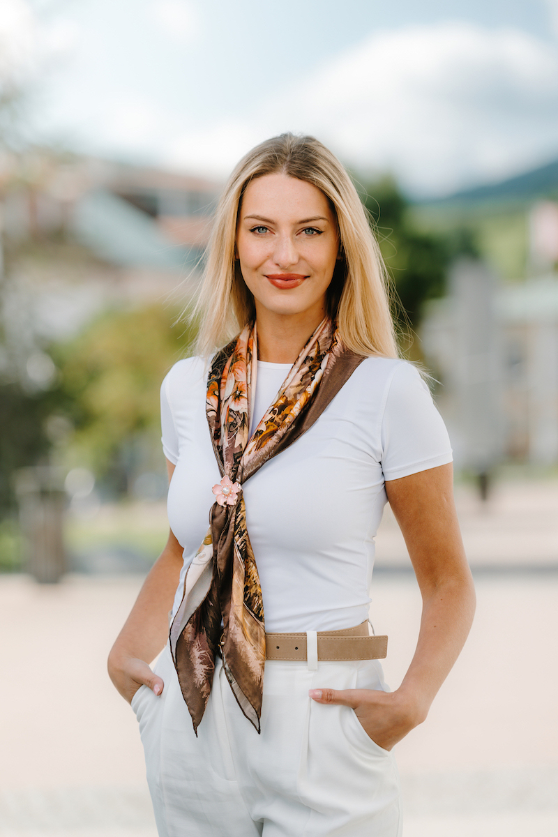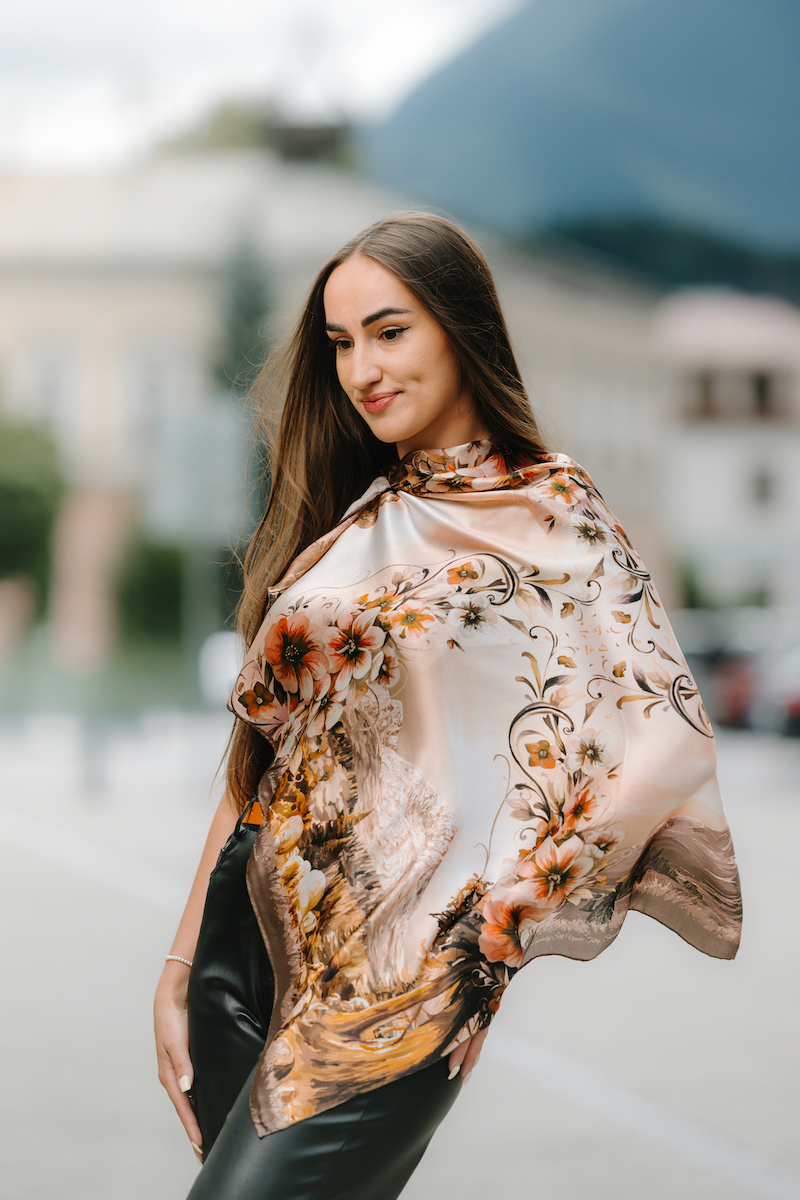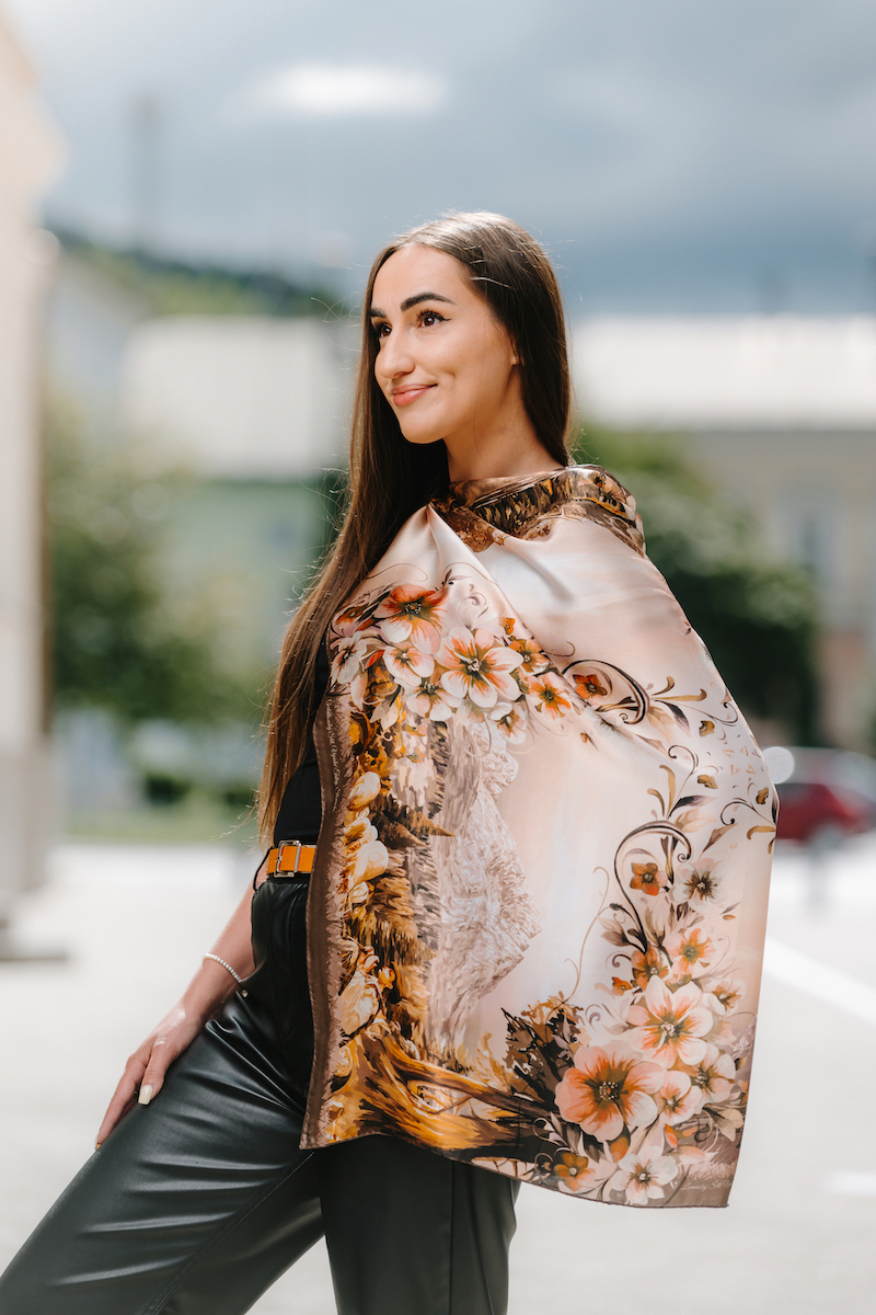 -klasická šatka okolo krku – vďaka vlastnostiam hodvábu je vhodné nosenie celoročne