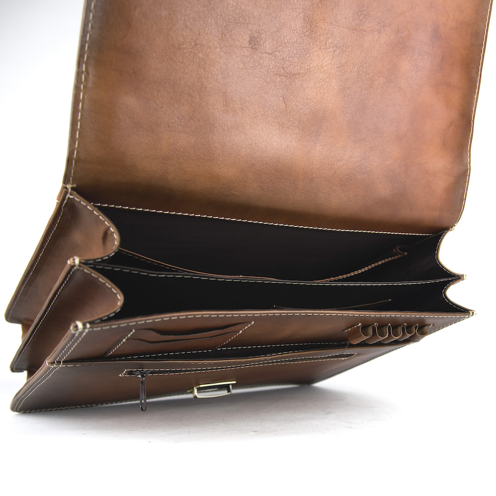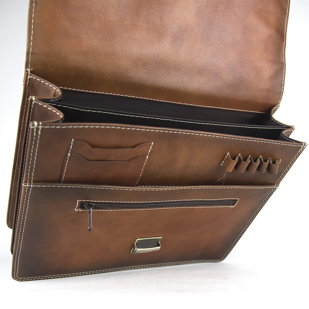 Používame len pravú hovädziu kožu z overených zdrojov. Tá sa postupne prispôsobuje svojmu majiteľovi, získava prirodzenú patinu a s časom sa stáva ešte krajšou. Každý detail – od šitia, cez zapínanie, až po vnútorné priečinky – je navrhnutý tak, aby spĺňal potreby moderného profesionála, ktorý si potrpí na kvalitu a spoľahlivosť.