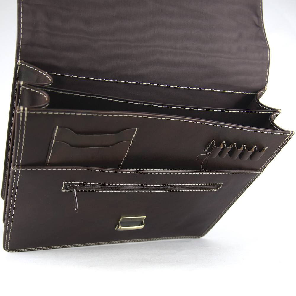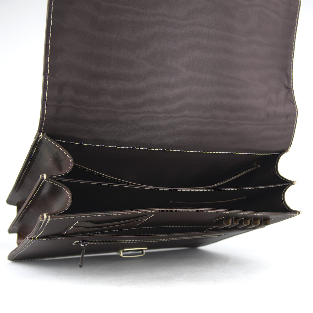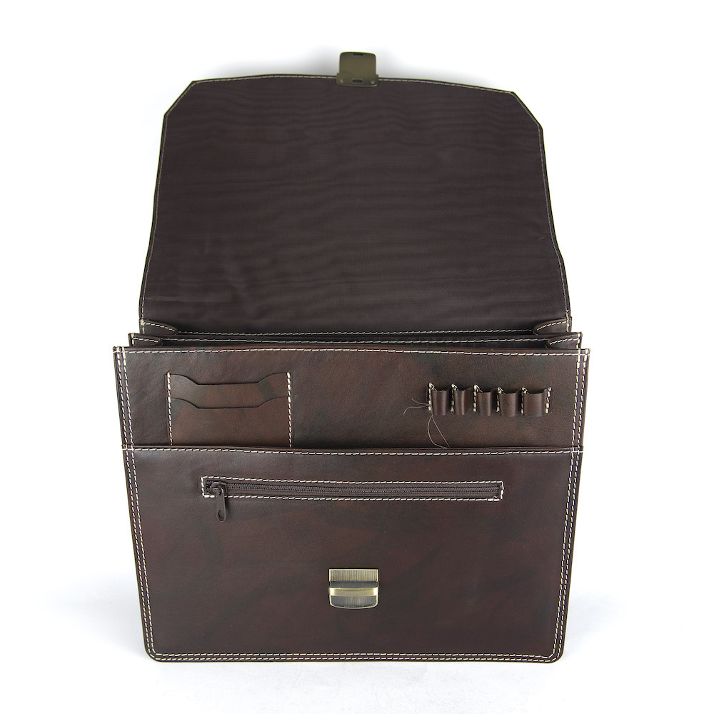 Používame len pravú hovädziu kožu z overených zdrojov. Tá sa postupne prispôsobuje svojmu majiteľovi, získava prirodzenú patinu a s časom sa stáva ešte krajšou. Každý detail – od šitia, cez zapínanie, až po vnútorné priečinky – je navrhnutý tak, aby spĺňal potreby moderného profesionála, ktorý si potrpí na kvalitu a spoľahlivosť.