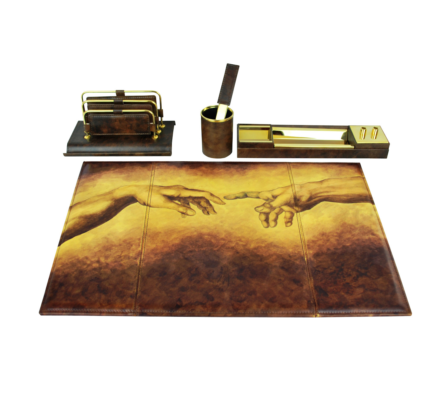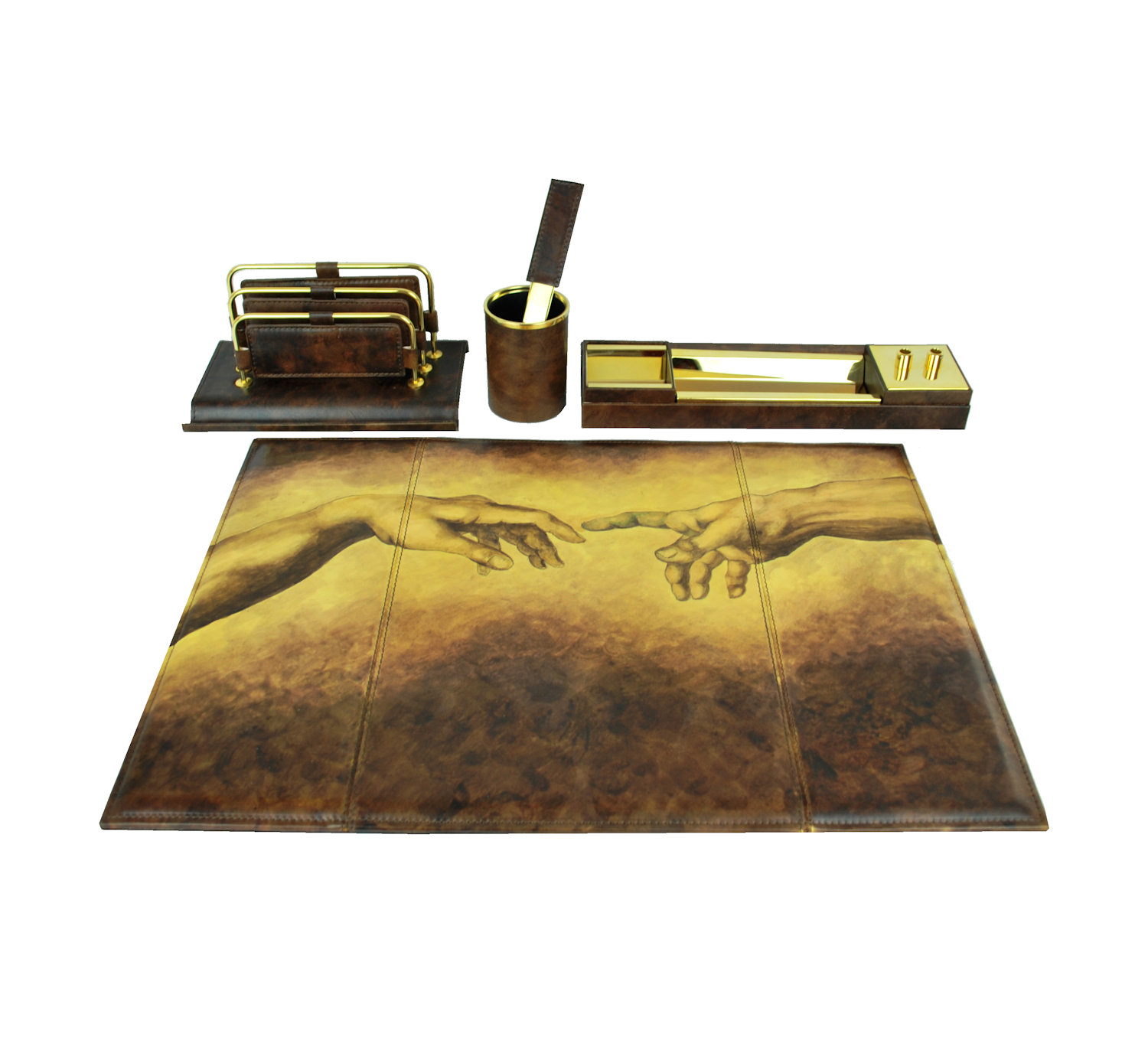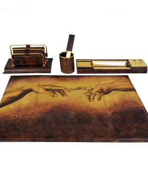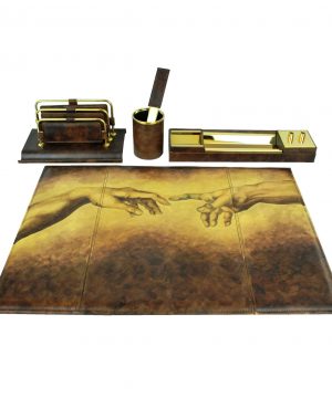 Umelecký ručne maľovaný kancelársky set vyrobený z pravej talianskej kože. Existuje len jeden kus. Každý jeden kus ručne maľovaných výrobkov je umelecké dielo. Kancelársky set je neopakovateľný originál s nádhernou maľbou. Spojenie unikátnej technológie s výtvarním umením vzniká unikátne a nenapodobiteľné dielo v podobe maľovaného koženého kancelárskeho setu s originálnym motívom.