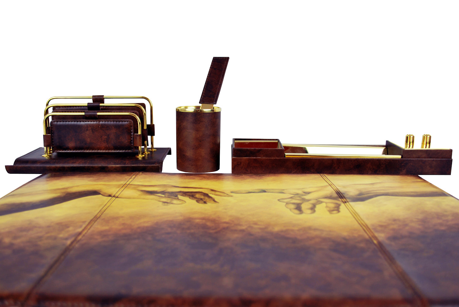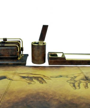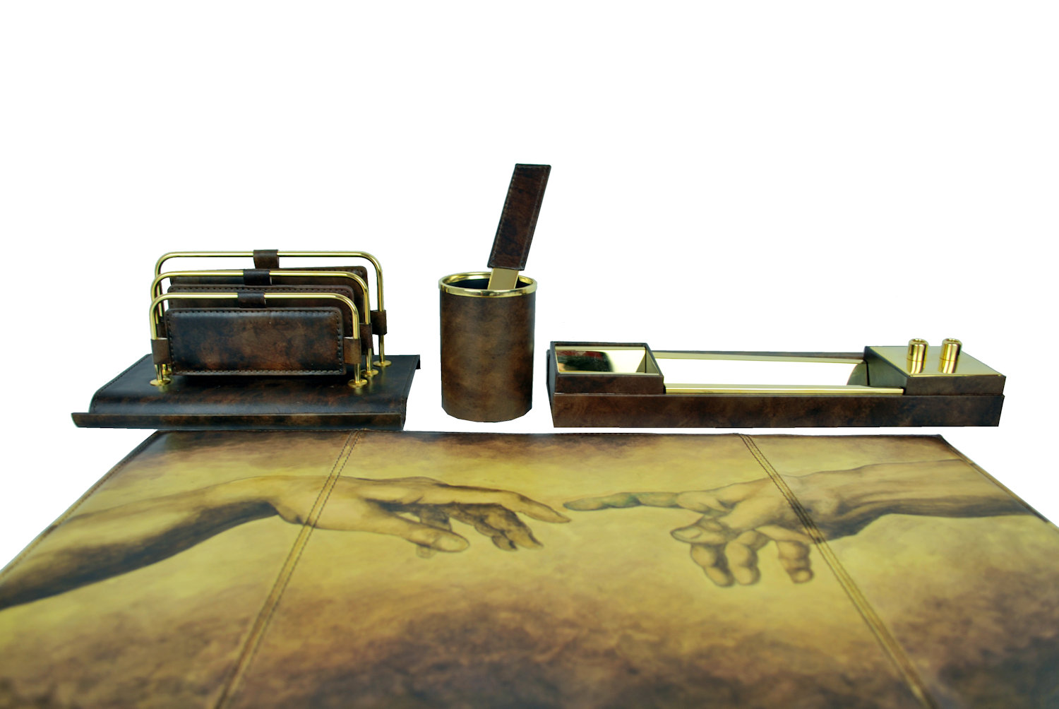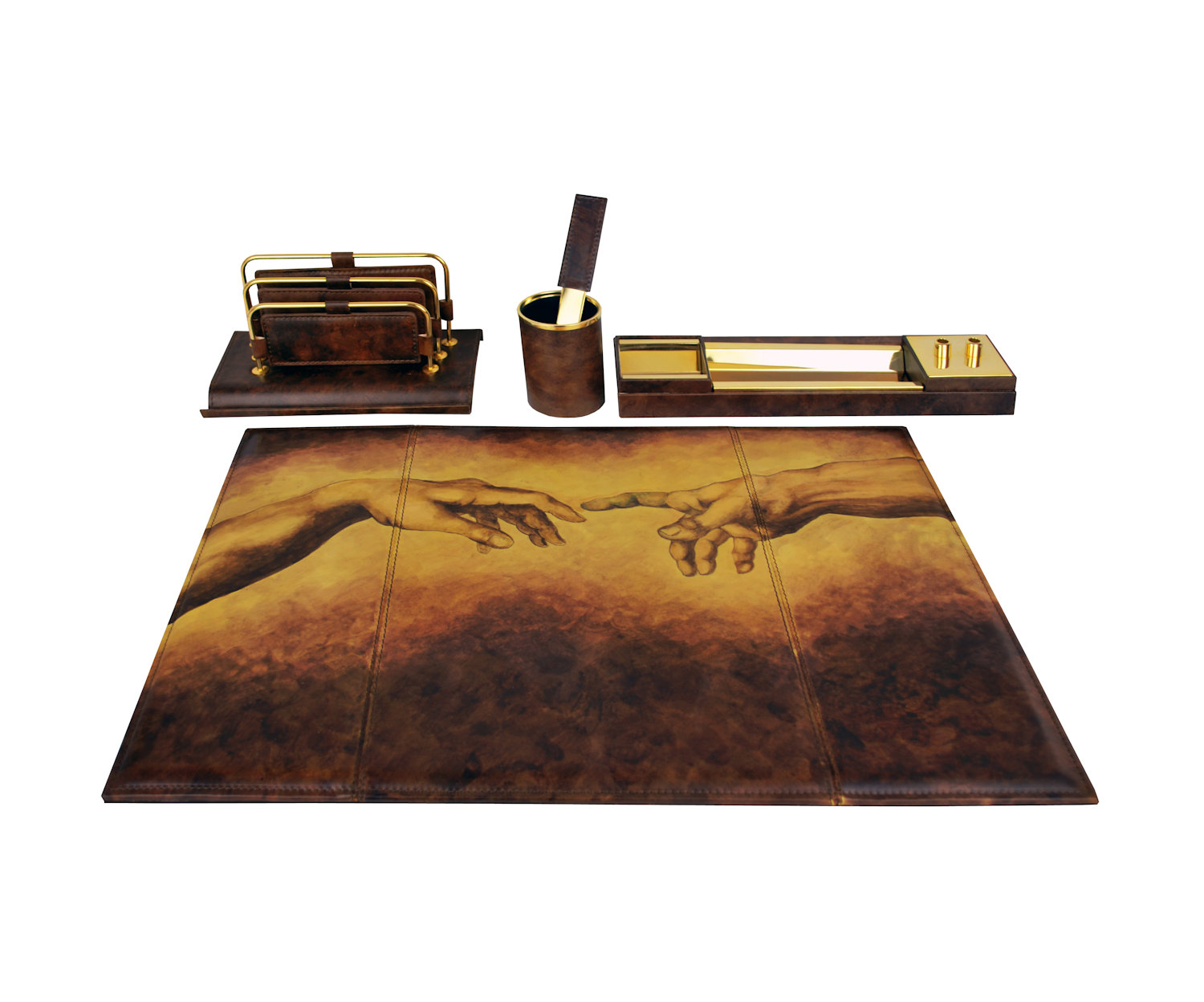 Umelecký ručne maľovaný kancelársky set vyrobený z pravej talianskej kože. Existuje len jeden kus. Každý jeden kus ručne maľovaných výrobkov je umelecké dielo. Kancelársky set je neopakovateľný originál s nádhernou maľbou. Spojenie unikátnej technológie s výtvarním umením vzniká unikátne a nenapodobiteľné dielo v podobe maľovaného koženého kancelárskeho setu s originálnym motívom.