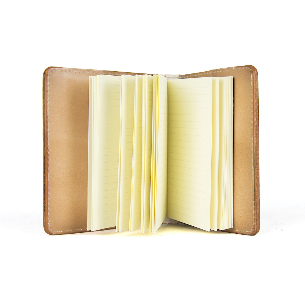 Kožený zápisník je vyrobený z pravej prírodnej hovädzej kože. Postupne je v rukách umelca koža opracovávaná niekoľkými druhmi nástrojov. Od prvotnej kresby a idei sa tak pomocou nožov, dlát, kladiva a podobne pretvorí klasický plochý kožený povrch na jemne plastické a reliéfne umelecké dielo. Následne sa dielo ručne namaľuje farbami určenými špeciálne na použitie na koži. Vďaka tomu farba vsiakne hlboko do kože, neotiera sa a aj pri poškodení či poškriabaní je farba stále viditeľná a celistvá. Koža je pevná a drží svoj tvar. Následné je zápisník ošetrený priehľadným lakom, ktorý chráni materiál pred bežným mechanickým poškodením a premočením. Zápisník z prírodnej kože je svojou veľkosťou vhodný do každej pánskej alebo dámskej tašky.